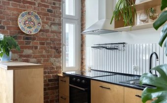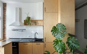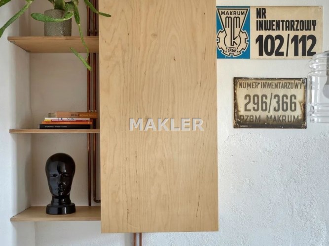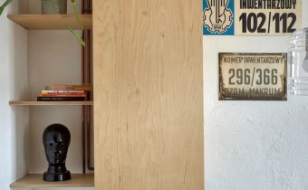 Zabudowy meblowe wykonane zostały z brzozowej sklejki, której ciepła kolorystyka w połączeniu z naturalnym światłem wpadającym przez duże okna sprawia, że mieszkanie jest niezwykle przytulne.