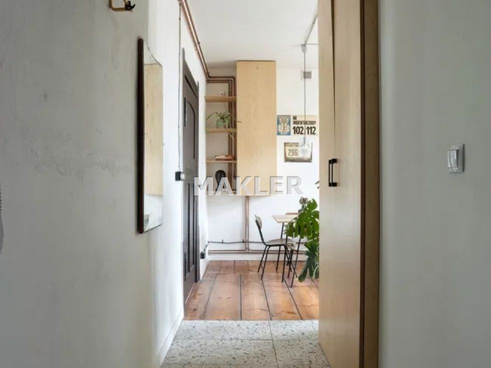Wnętrze mieszkania zachwyca autentycznymi elementami architektonicznymi, które nadają mu wyjątkowego charakteru.