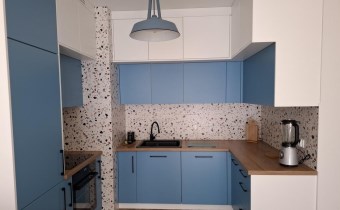 Wnętrze zostało urządzone w nowoczesnym stylu, z wykorzystaniem trwałych i estetycznych materiałów. Wszystkie zabudowy wykonane zostały na wymiar przez stolarza, z zastosowaniem osprzętu marki BLUM, co podkreśla wysoki standard wykończenia oraz funkcjonalność przestrzeni.