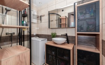 W łazience nowoczesne meble w stylu loftowym. Oddzielna toaleta cała w glazurze.