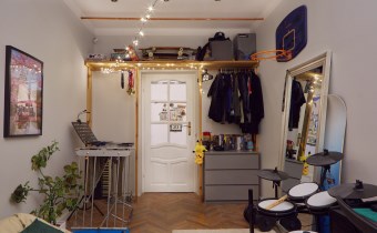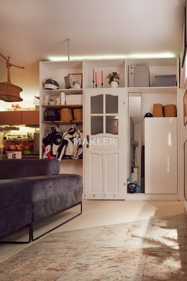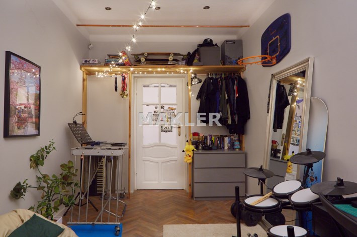 Na podłogach znajduje się drewniany parkiet, który nadaje wnętrzu ciepły i klasyczny charakter.