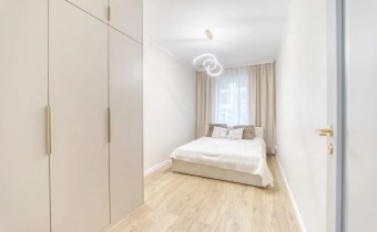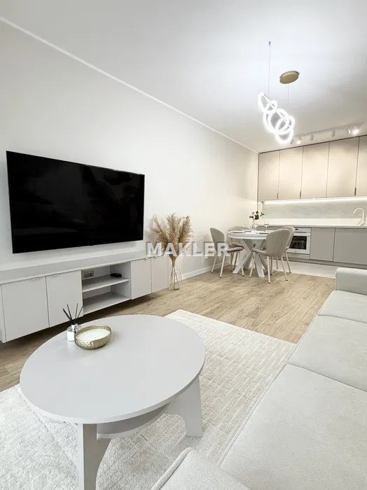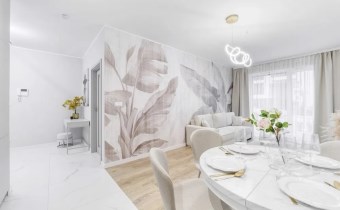 Mieszkanie zostało urządzone w ponadczasowym stylu — dominują tu ciepłe beże, naturalne drewno oraz nowoczesne oświetlenie, dzięki czemu wnętrze prezentuje się bardzo elegancko i przytulnie. Wszystkie zabudowy wykonane zostały na wymiar przez stolarza, co podkreśla wysoki standard wykończenia i pozwala maksymalnie wykorzystać dostępną przestrzeń.