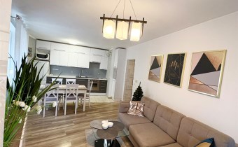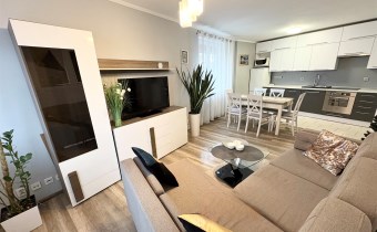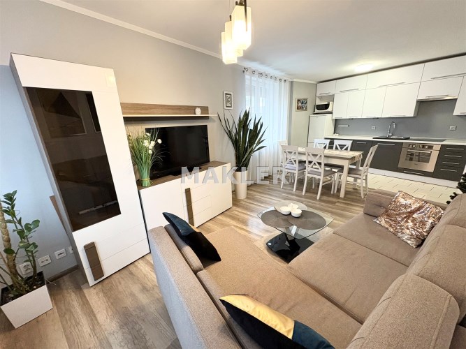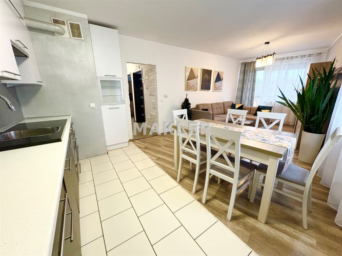 Właścicielka zadbała o to, aby mieszkanie było wyposażone w sposób funkcjonalny, dzięki czemu w przedpokoju pełni rolę zabudowy na wymiar, aw sklepie podział na wygodną strefę, ze sporym balkonem, jak i kuchenną z dużą szafką. Sypialnie zostało dostarczone jako strefa rodziców z łóżkiem małżeńskim a drugi jako pokój dla dziecka lub miejsce do pracy. W razie potrzeby aranżacja wedle potrzeb nie przysporzy ci żadnego problemu.
