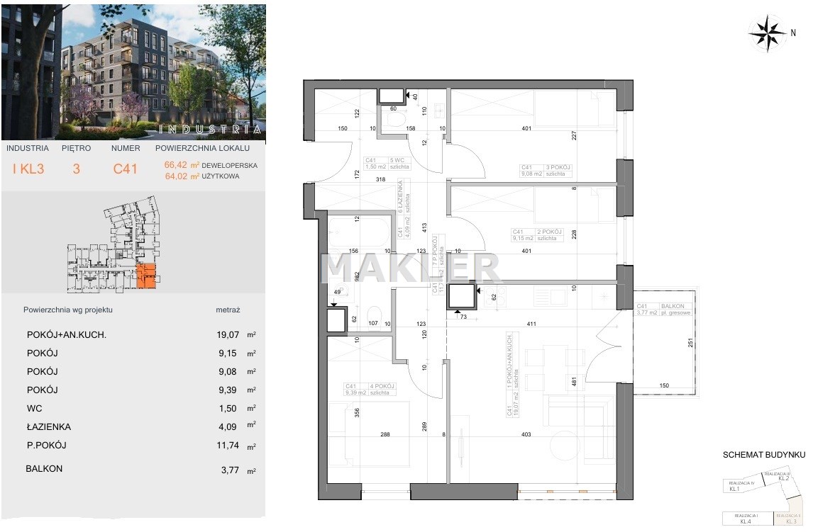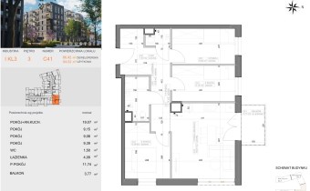 Przedstawiamy 4 pokojowe, mieszkanie o powierzchni 64,02m2 na 4 piętrze nowoczesnego bloku z windą i balkonem.