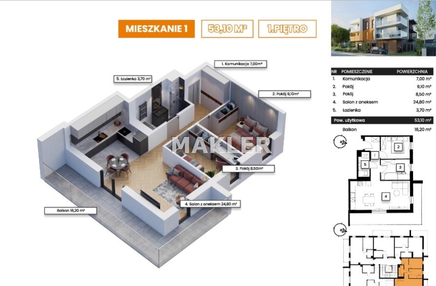 Przedstawiamy 3 pokojowe mieszkanie o powierzchni 53,13 m2 na 1 piętrze w bloku usytuowanym w bliskości pięknych terenów zielonych.
