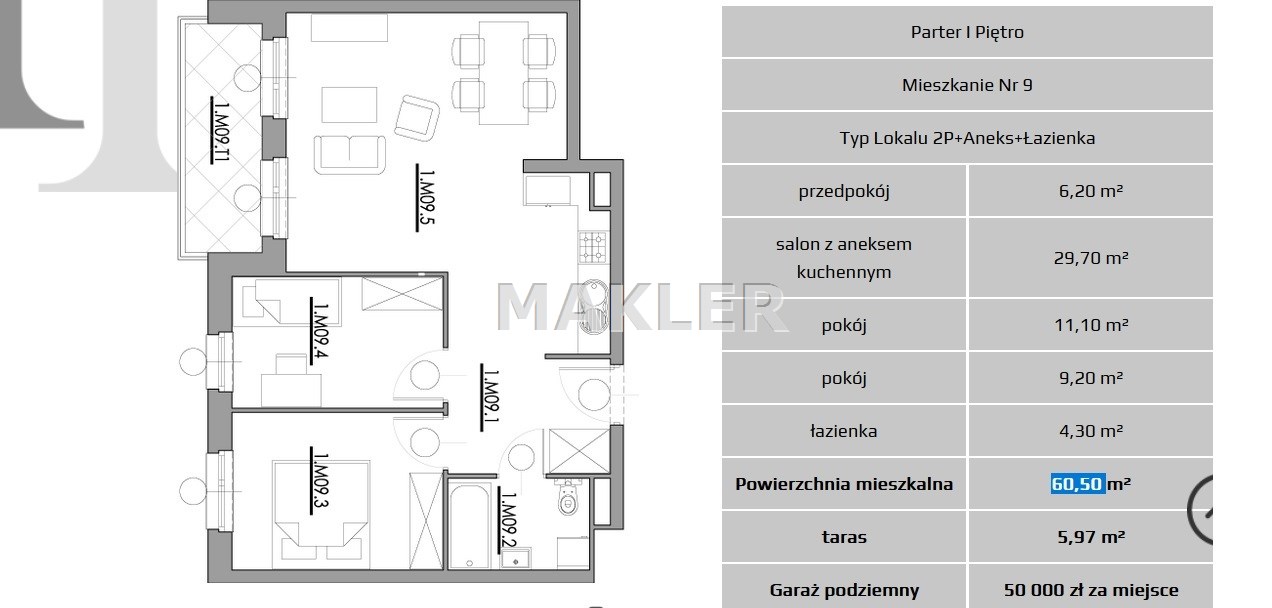 60,50 m² na 1 piętrze z tarasem.