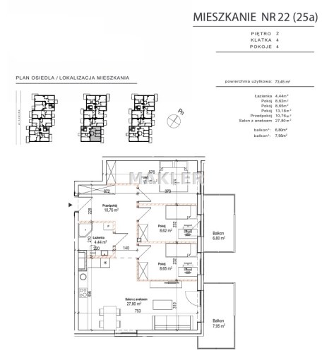 Przedstawiamy 4 pokojowe mieszkanie o powierzchni 73,45m2 na 2 piętrze kameralnego 2 piętrowego bloku z windą