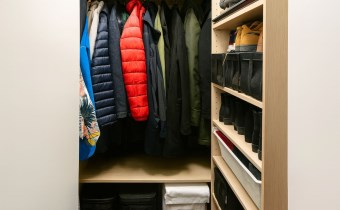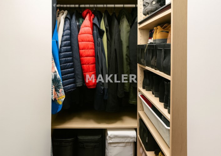 nowoczesna zabudowa łazienkowa z ukrytą pralką oraz prysznicem typu walk-in