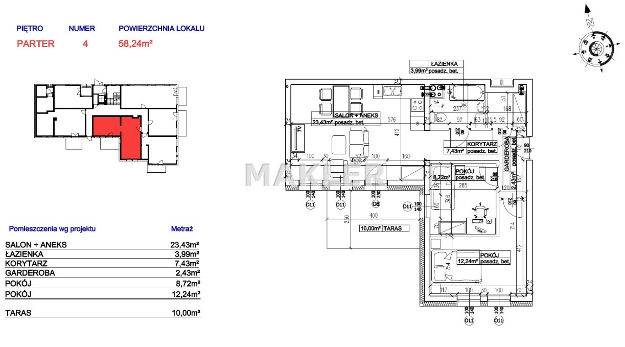 Przedstawiamy 3 pokojowe mieszkanie o powierzchni 58,24 m2 na parterze nowoczesnego bloku