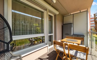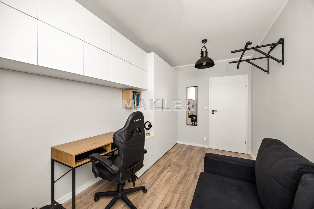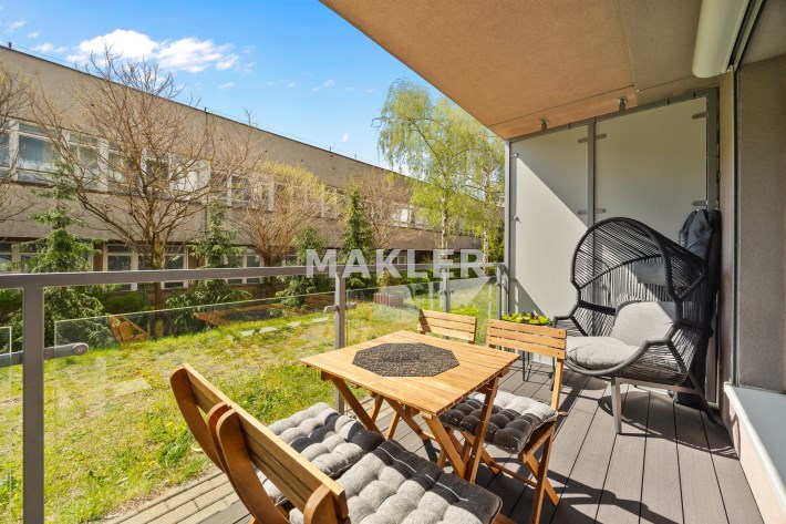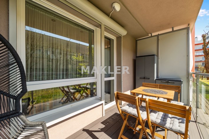 Duży balkon wychodzi na spokojną, zieloną część osiedla – bez ruchu samochodowego pod oknami. To ogromna różnica w codziennym komforcie.