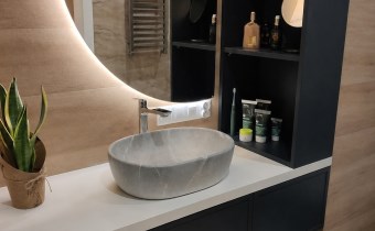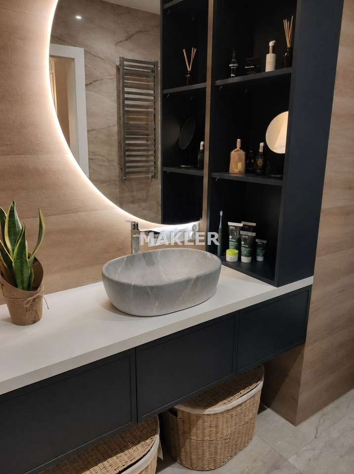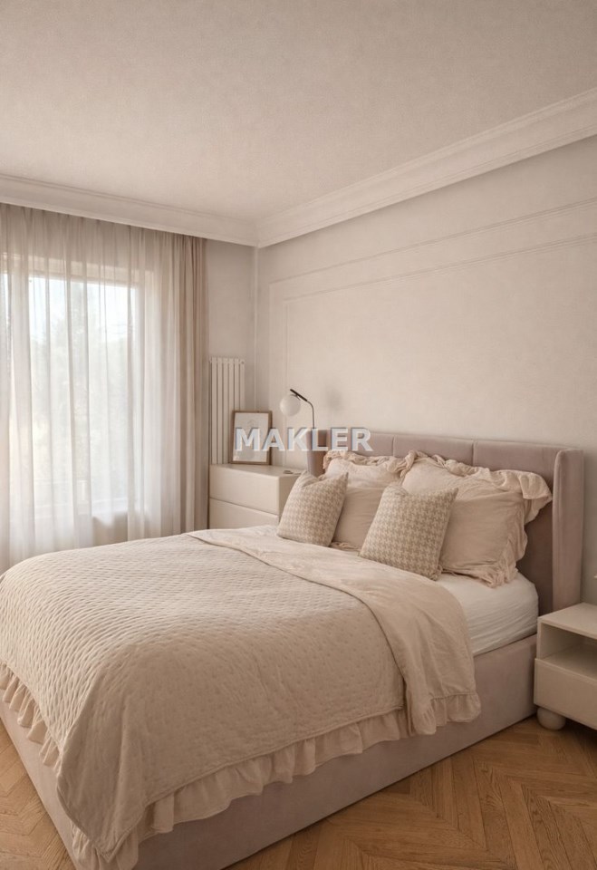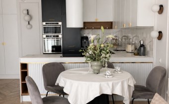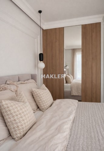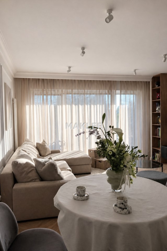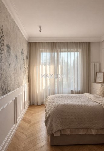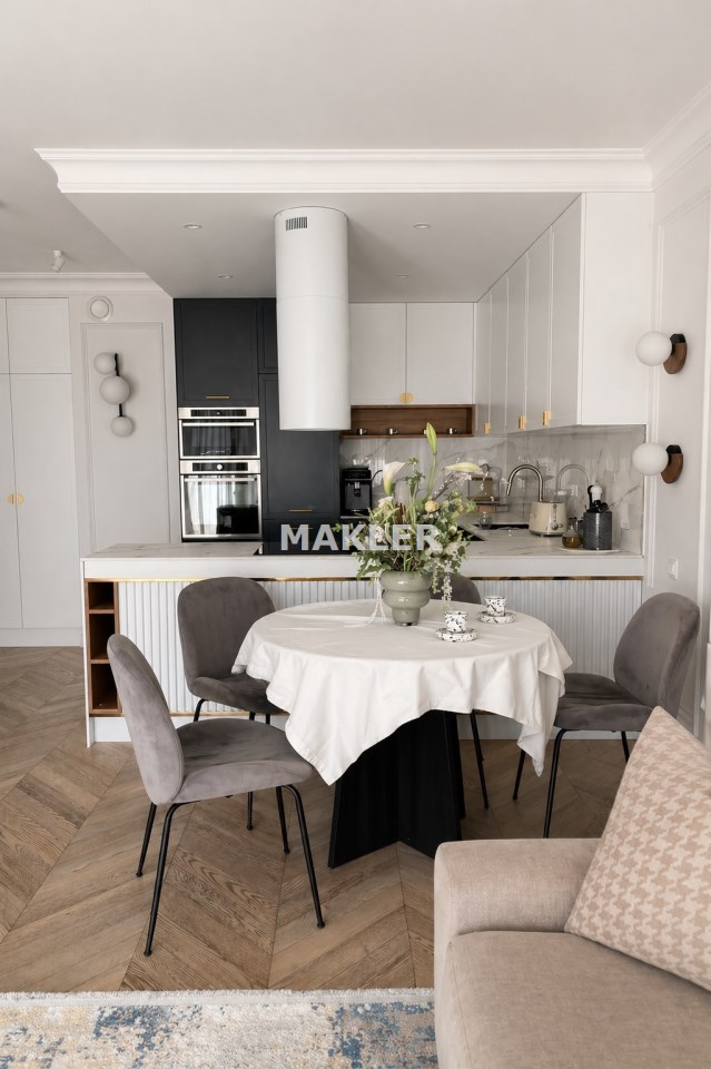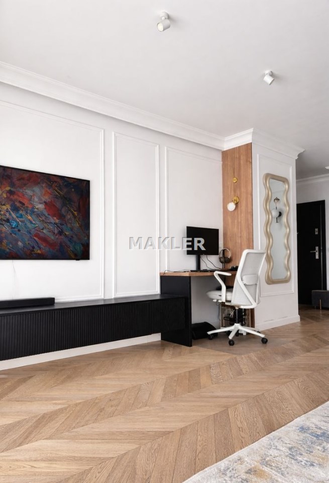 Mieszkanie o powierzchni około 63 m² usytuowane jest na parterze w niskim bloku z 2021 roku. Lokal został urządzony w eleganckim stylu modern classic, który łączy przytulność z ponadczasową estetyką. Wnętrze wyróżnia się harmonijną kolorystyką, sztukateriami, dekoracyjnym oświetleniem oraz efektowną podłogą ułożoną w jodełkę.