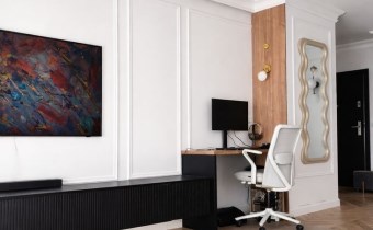 Wnętrze mieszkania zostało zaprojektowane z myślą o wygodzie codziennego życia. Otwarta strefa dzienna łączy salon z kuchnią, tworząc przyjazną i reprezentacyjną przestrzeń. Dodatkowo wygospodarowano tu miejsce do pracy lub nauki, które idealnie wpisuje się w charakter wnętrza.