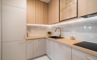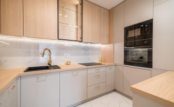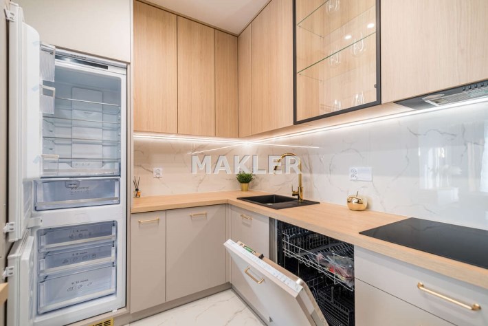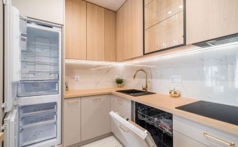 zabudowa kuchenna na wymiar z kompletem AGD: lodówka, zmywarka, piekarnik, mikrofalówka, płyta indukcyjna, okap,