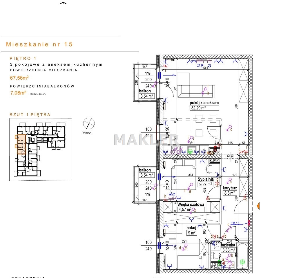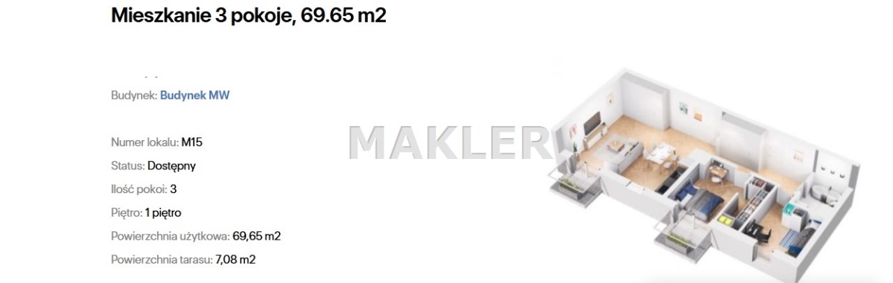 Przedstawiamy 3 pokojowe mieszkanie o powierzchni 69,65 m2 na 1 piętrze w nowym bloku z windą i balkonem.