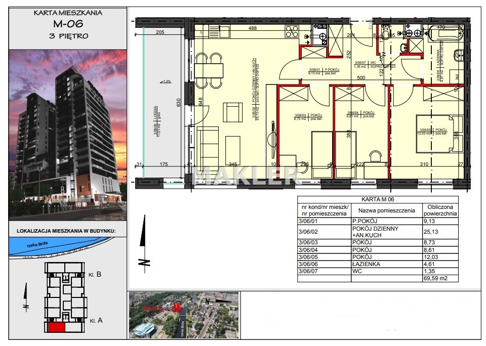 Prestiżowa lokalizacja, nowoczesny, dobrze wyposażony budynek stał już się nowym symbolem Bydgoszczy, który zdefiniował pojęcie luksusu, zapewni sukces i odzwierciedli aspiracje mieszkańców. Przepiękne otoczenie rzeki gwarantuje bliskość terenów spacerowych. Z drugiej strony - mimo, że wśród zieleni, nadal jesteśmy w samym centrum miasta. Blisko stąd do centrów handlowych Focus Mall i ważnych węzłów komunikacyjnych. Obok znajduje się rondo Toruńskie, trasa Uniwersytecka, dworzec PKS, przystanki tramwajowe i autobusowe, hala sportowo widowiskowa „Łuczniczka” gdzie organizowane są różne imprezy, oraz słynne lodowisko TORBYD. Do ścisłego centrum jest stąd zaledwie kilka minut spacerem. W pobliżu inwestycji znajdują się restauracje oraz hotele, obiekty sportowe i kulturalne, szkoły i kina. Okolica zapewnia bezpośredni dostęp do niezwykłych miejsc takich jak muzea czy filharmonia. Charakterystyka okolicznej zabudowy jest gwarantem, że w bezpośrednim sąsiedztwie nie powstanie już inny podobny budynek, co z kolei gwarantować będzie niezwykłe widoki na panoramę miasta.