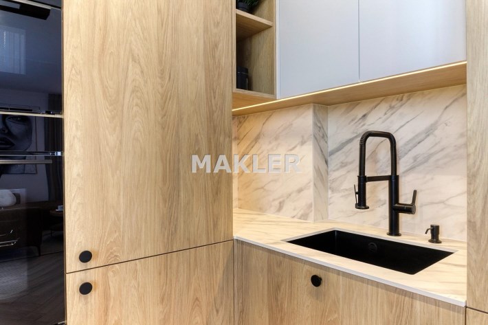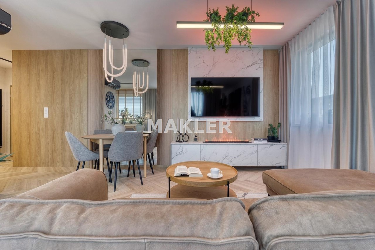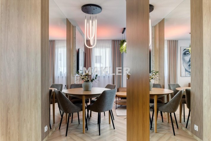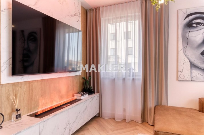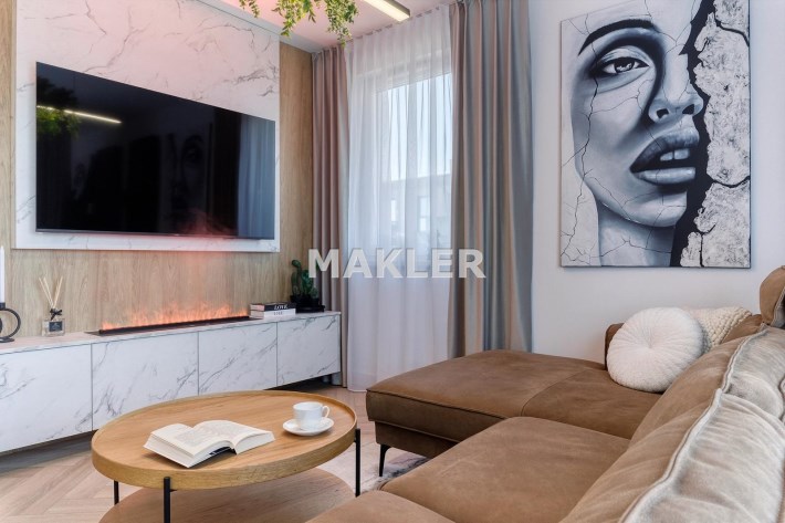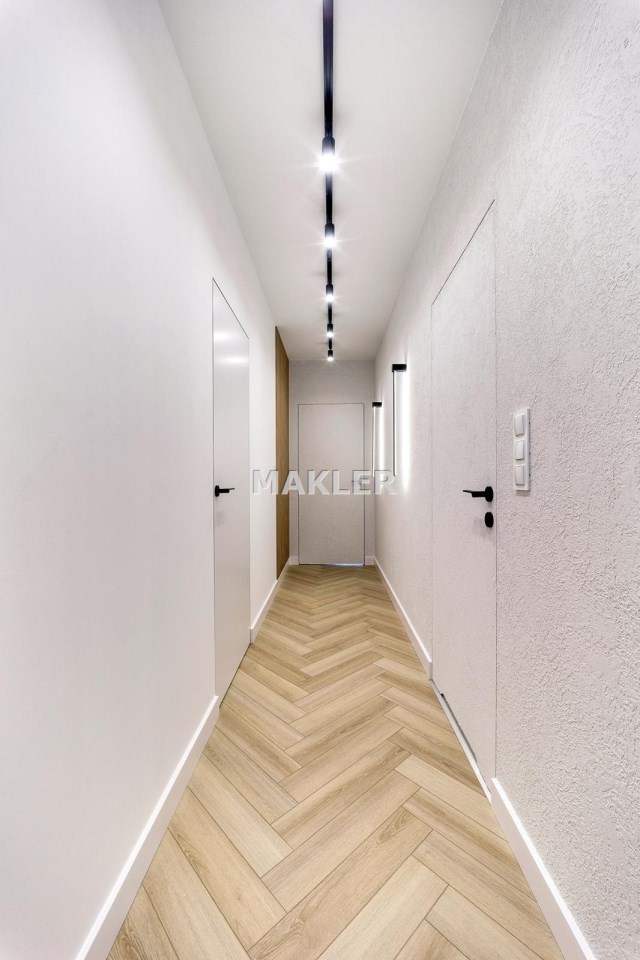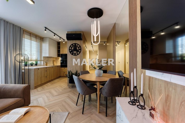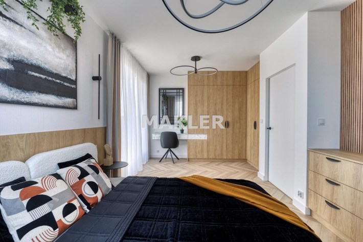 Wnętrze jest jasne i dobrze doświetlone naturalnym światłem. Wyposażenie wysokiej jakości począwszy od podłóg, oświetlenia, przez stolarkę drzwiową aż po zabudowy i wyposażenie.