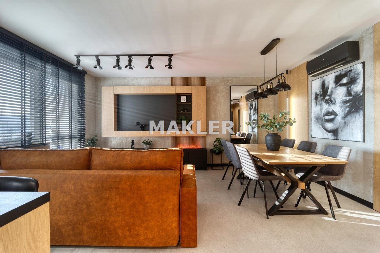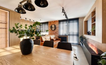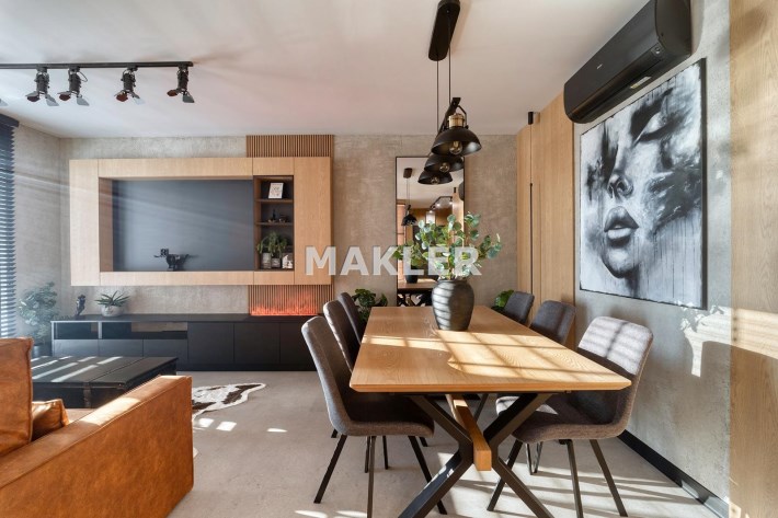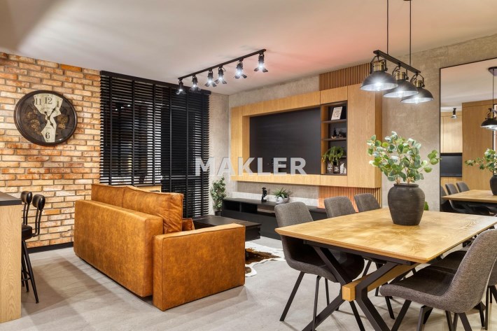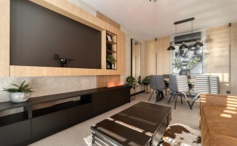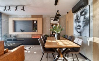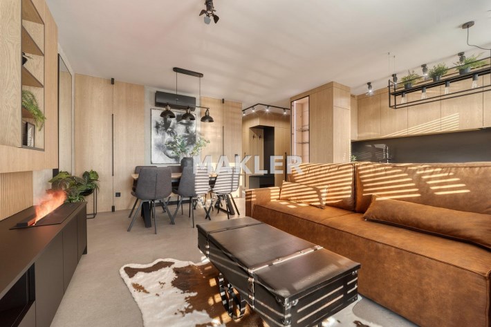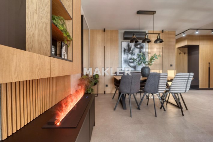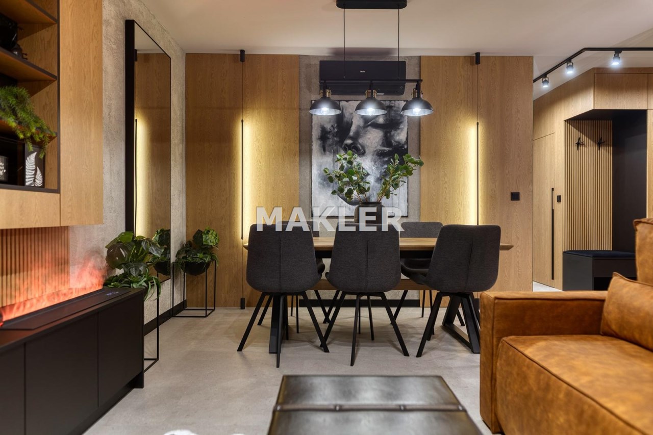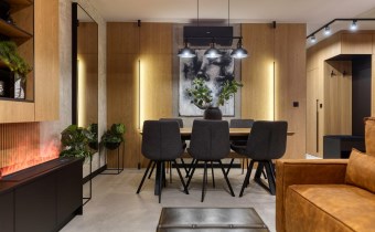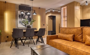Część dzienna urządzona została m.in. w rozkładaną sofę, elegancki stół, designerskie obrotowe krzesła, stolik kawowy oraz kominek, który nadaje wnętrzu wyjątkowej, luksusowej atmosfery.