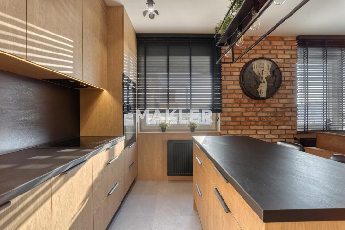 Kuchnia wykonana w zabudowie na wymiar, wyposażona w komplet wysokiej klasy sprzętów AGD: lodówkę, zmywarkę, piekarnik, kuchenkę mikrofalową, okap oraz płytę indukcyjną.