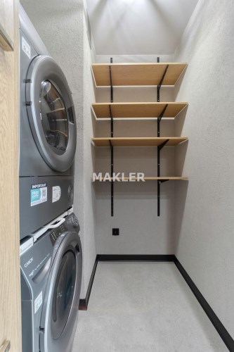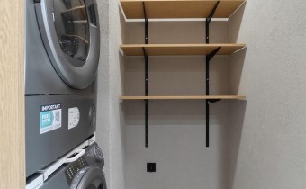 Wyposażona w pralkę, suszarkę oraz zabudowę do przechowywania.