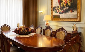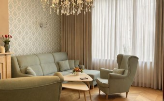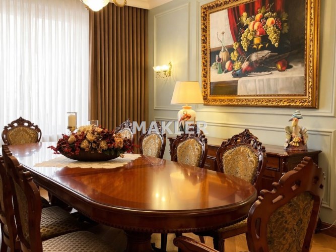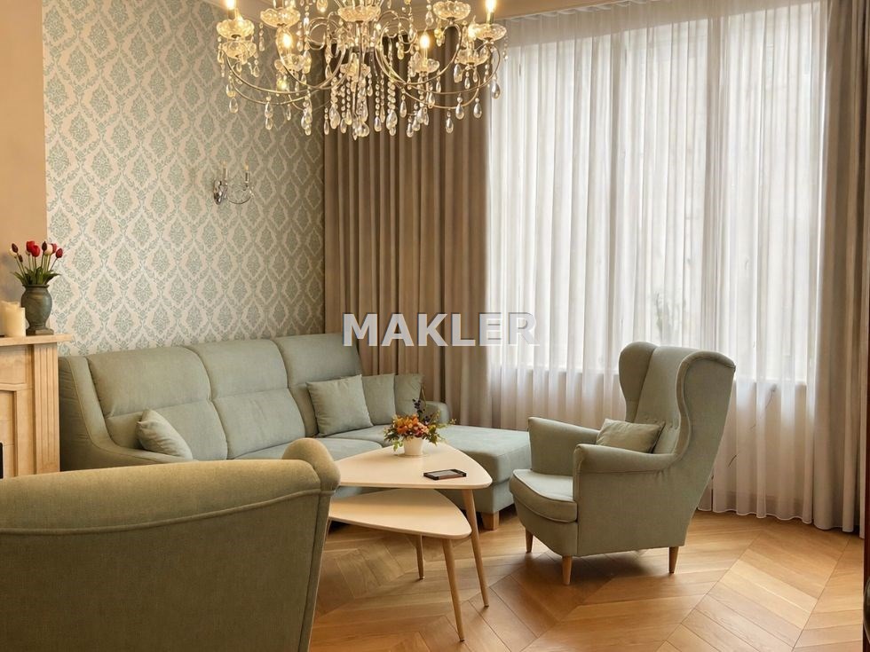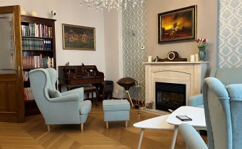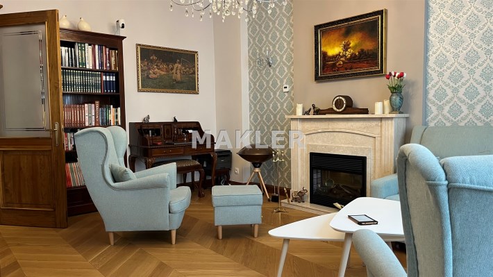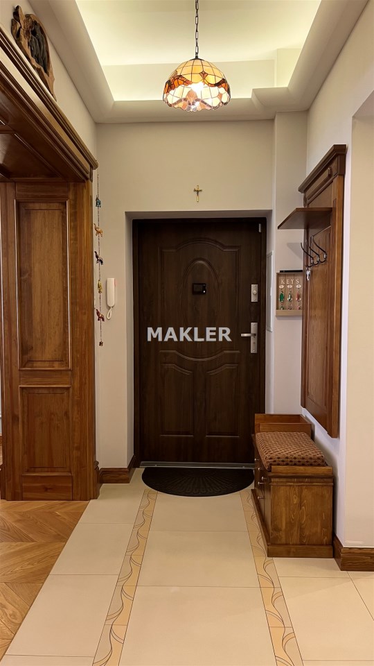 Wnętrze mieszkania wykończono z wykorzystaniem materiałów klasy premium. Stolarka drzwiowa wykonana została ręcznie z jesionu, a zastosowane zamki magnetyczne podkreślają nowoczesny charakter przestrzeni. Drewniany parkiet, układany ręcznie, w połączeniu z elegancką sztukaterią sufitową oraz sufitami podwieszanymi z izolacją akustyczną tworzy harmonijną i komfortową przestrzeń do życia.