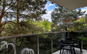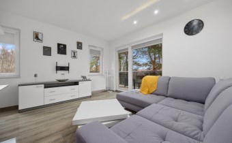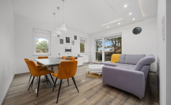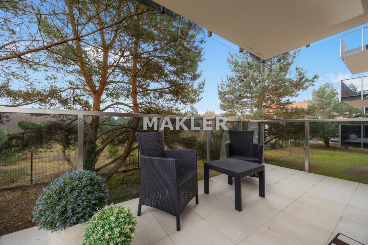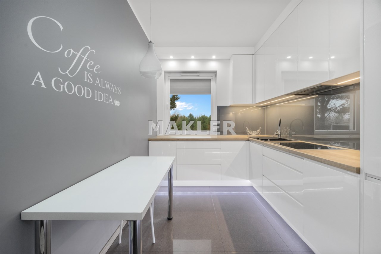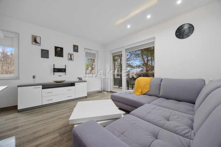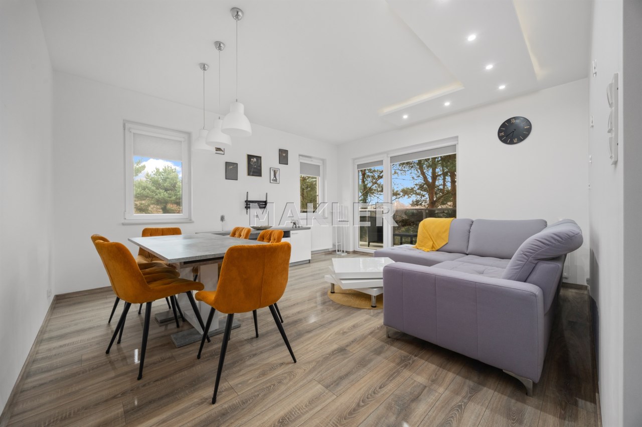 - przestronny salon z wyjściem na 13-metrowy taras, który zaprasza do porannej kawy w promieniach słońca pośród drzew,