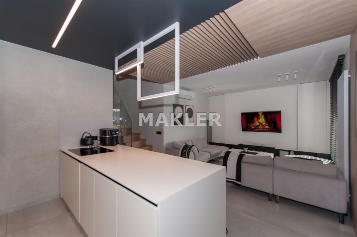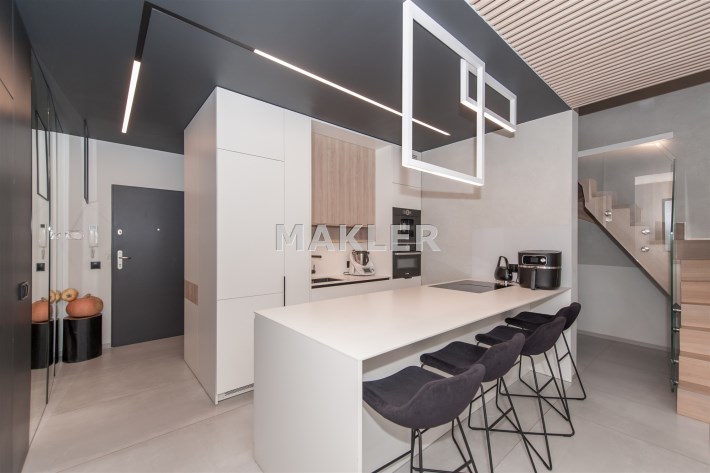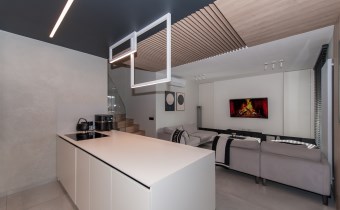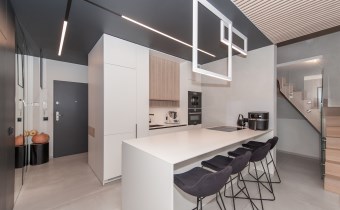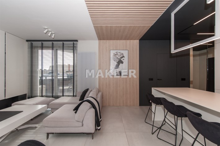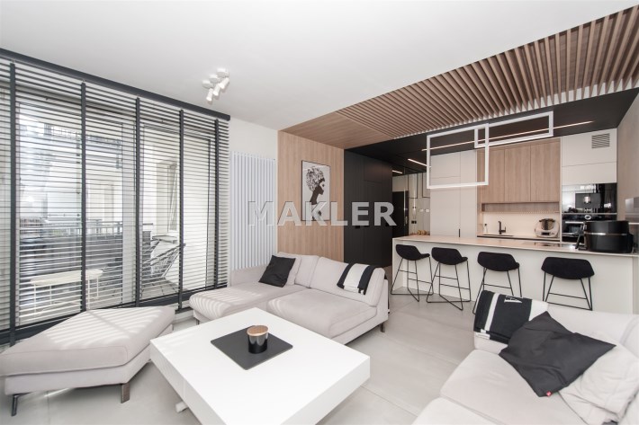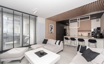 Właściciele zadbali o to by apartament był nie tylko atrakcyjny lecz przede wszystkim funkcjonalny. Salon łączy w sobie zarówno elegancję jak i przytulność. Otwarta na salon i w pełni wyposażona w sprzęty AGD kuchnia daje komfort i swobodę podczas przyrządzania posiłków. Meble zostały zaprojektowane na wymiar a sprzęty renomowanych marek są estetycznie zabudowane co sprawia, że kuchnia jest idealnym dopełnieniem salonu.