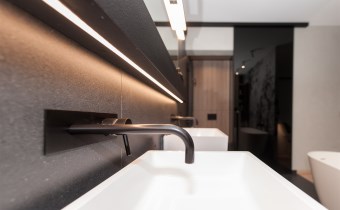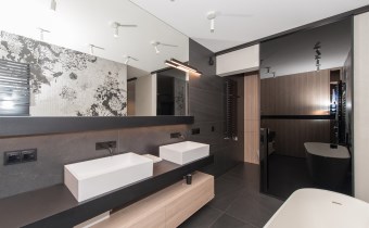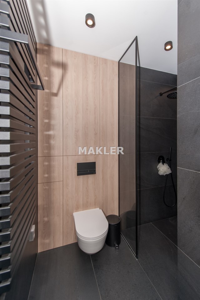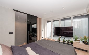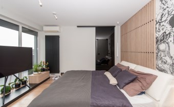 Na górze do Państwa dyspozycji jest przestronna sypialnia wraz z dużą garderobą. Małżeńskie, komfortowe łoże z zagłówkiem z printem na ścianie zestawionym z lamelami. Całość nabiera trójwymiarowego efektu. Za drzwiami sypialni kryje się komfortowa łazienka wyposażona w wygodny prysznic oraz wolnostojącą wannę. To miejsce, które zagwarantuje Państwu wypoczynek w komfortowych warunkach. Należy zwrócić uwagę na przemyślane oświetlenie w całym apartamencie, które pozwala odpowiednio nakierować światło w zależności od Państwa potrzeb do pracy lub relaksu co ma znaczący wpływ na komfort. Kolorystyka bieli, drewna, czerni oraz betonu sprawia, że już po przekroczeniu progu czujemy się tu bardzo przyjemnie.