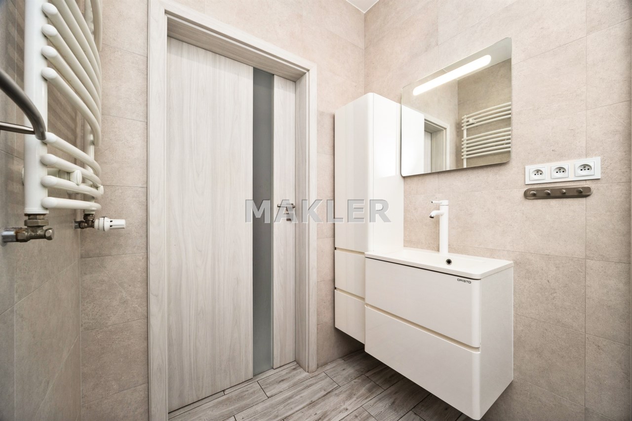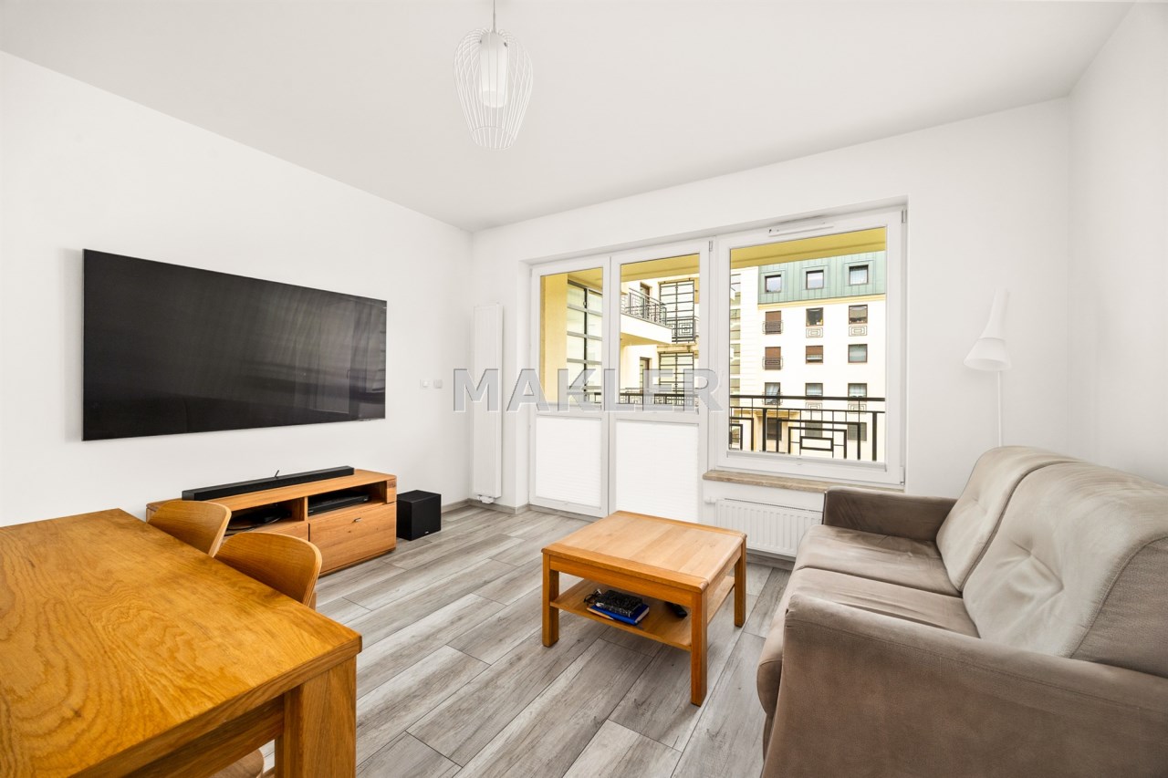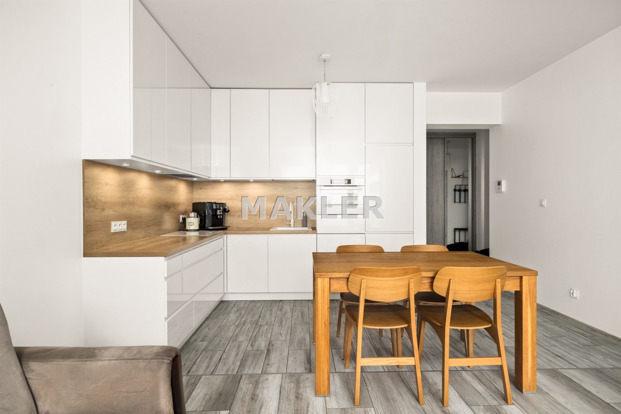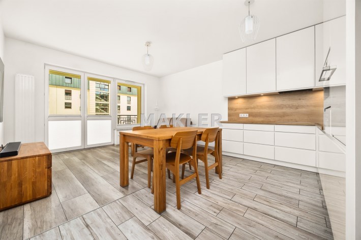 Centralnym punktem mieszkania jest przestronny salon połączony z kuchnią wyposażoną w sprzety AGD renomowanych marek, tworzący reprezentacyjną i pełną naturalnego światła strefę dzienną z wyjściem na taras. To idealne miejsce do relaksu, spotkań z bliskimi oraz celebrowania codzienności w eleganckim otoczeniu.