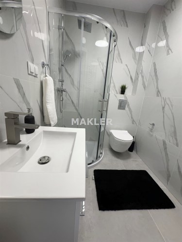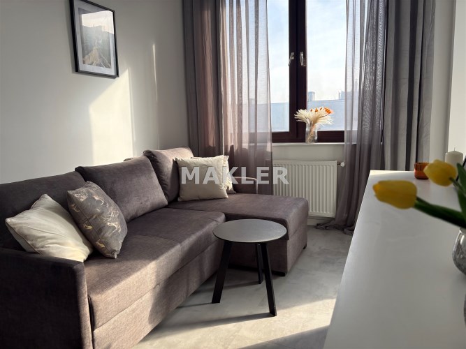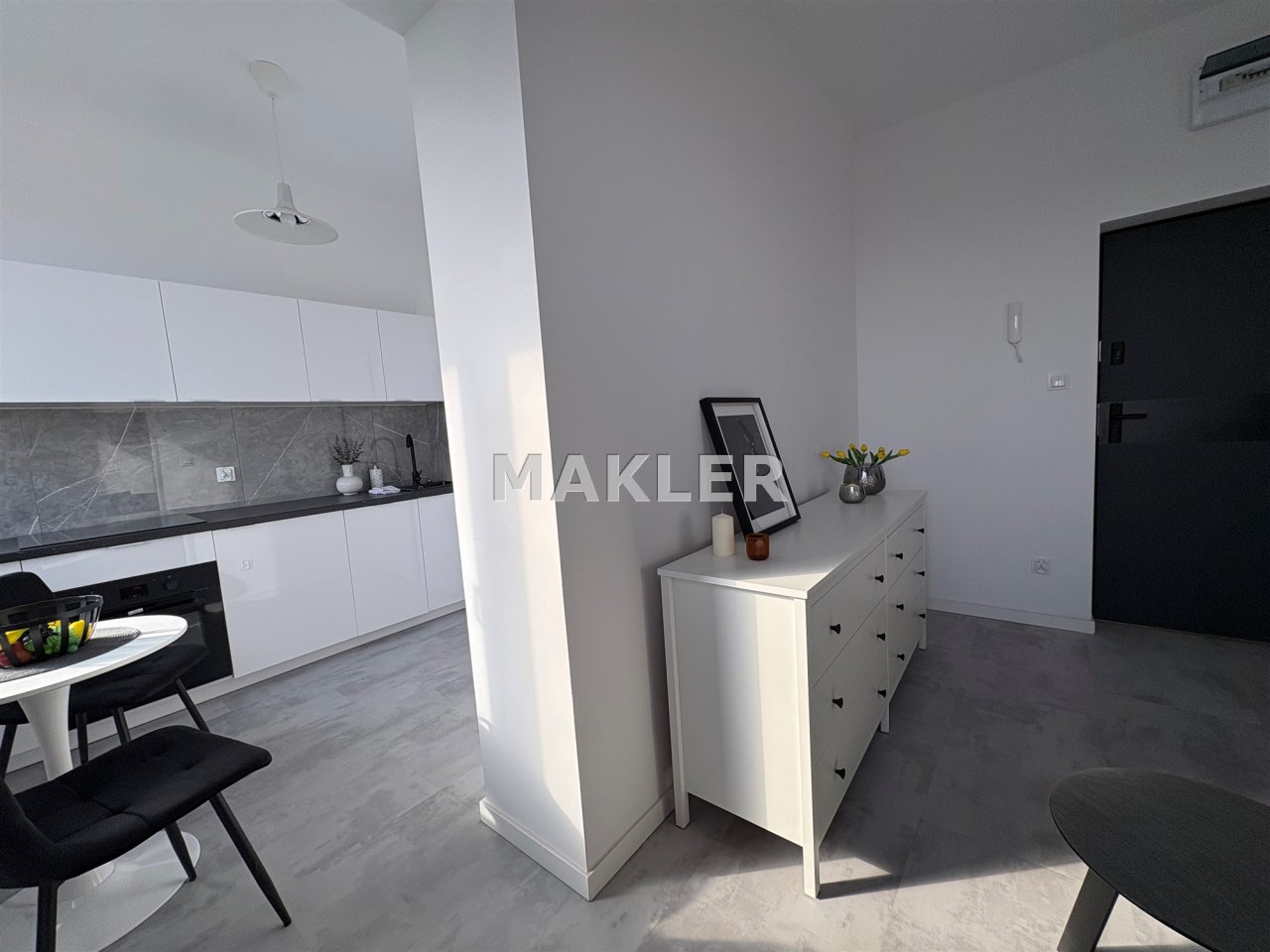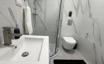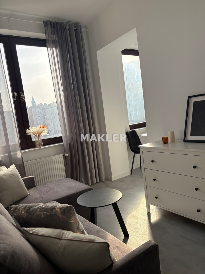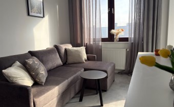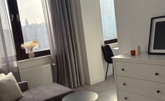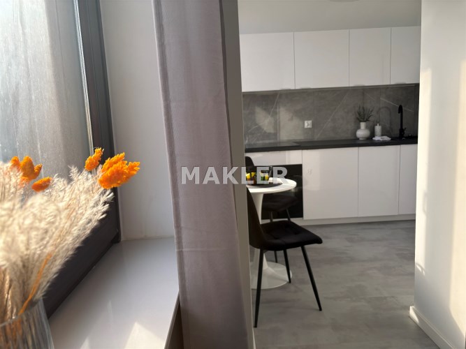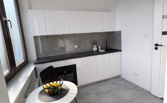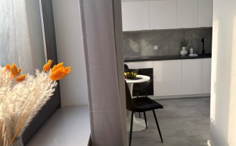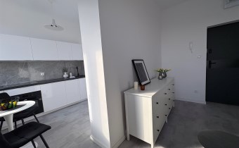 Kolorystyka bieli, szarości i dekoracyjnej czerni. Duże okna dzięki czemu w mieszkaniu jest jasno. Salon to idealne miejsce do wypoczynku jak i do pracy. Nowoczesna kuchnia ze sprzętem AGD. Łazienka w pięknych kaflach z prysznicem.